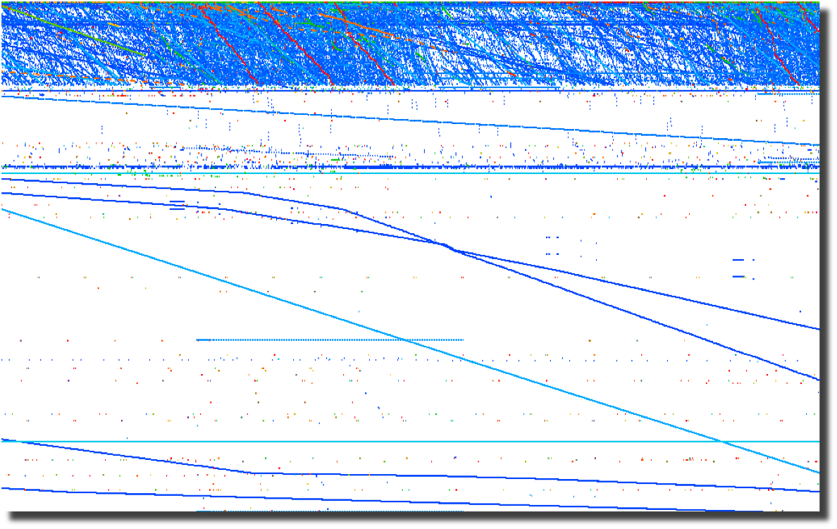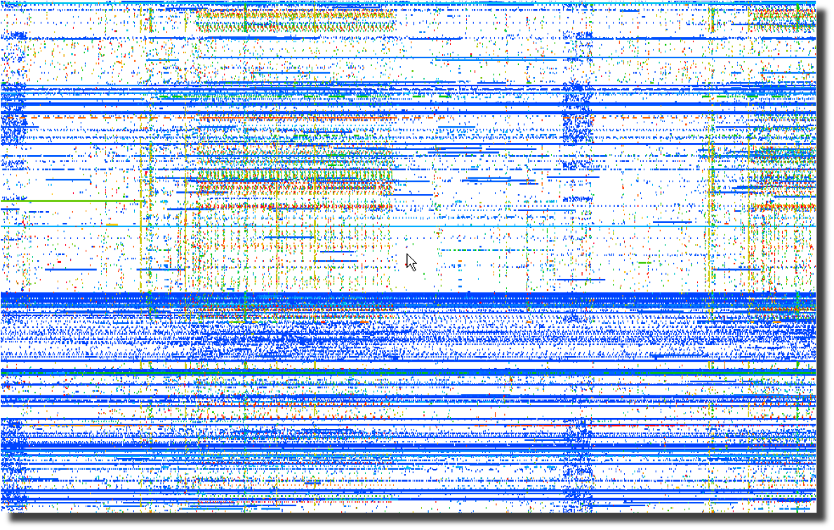 The y-axis is a list of all infected machines so each horizontal line is a single system (Host names clipped for anonymity). The color coding is based on the name of the malware with similar names having similar colors on the pallet. Analysis of the four solid verticals outside of the weekly schedule scan pattern (the consistent vertical pattern across all the plots) were four different outbreaks of a network scanner where signature updates were loaded across all systems and the IPS started detecting and blocking immediately. The analysis was done to evaluate the effectiveness of an A/V deployment. The initial impact was a clear determination that the A/V system needed some attention and over time, the analysis was used to re-enforce the value of enabling additional options in the A/V system. Ongoing analysis shows the tempo of malware detects and changes to the A/V environment.